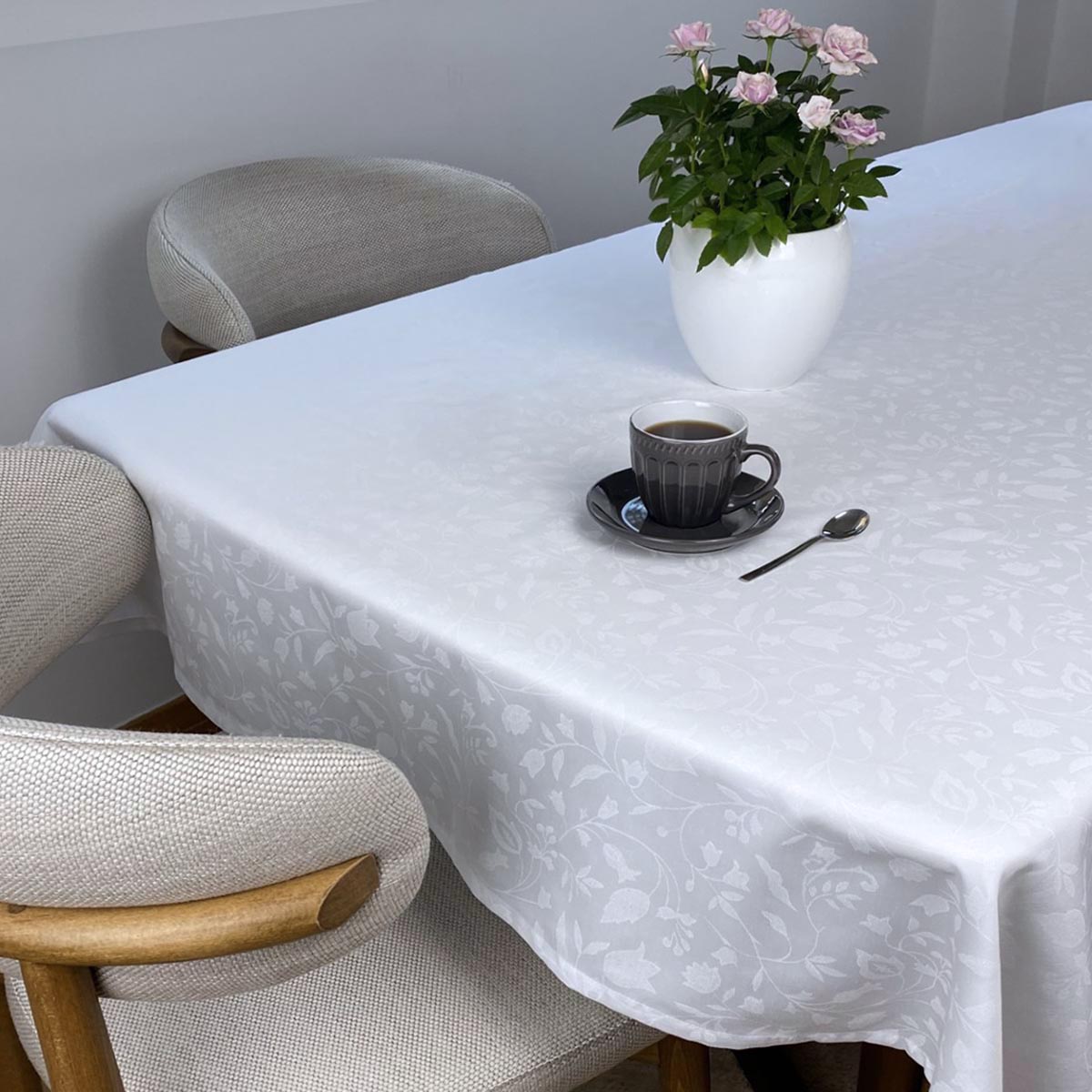 Τραπεζομάντηλο σε λευκό χρώμα με φλοράλ ζακάρ σχέδιο. Κατασκευασμένο από σατέν ζακάρ ύφασμα που το κάνει απαλό και με γυαλιστερή όψη.